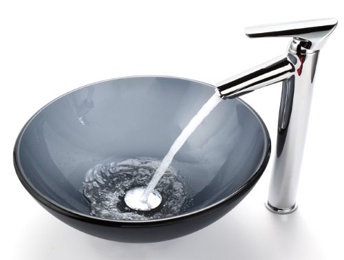 Add a touch of elegance to your bathroom with a glass sink combo from Kraus. Stylish Brown glass sink and matching waterfall faucet will complement any bathroom decor Installing Kraus combo is an ideal home improvement project. Glass sink is constructed from solid tempered glass. Sink features polished glass interior and exterior. Designed for above counter installation with standard US plumbing connections. Solid brass umbrella pop-up drain and mounting ring are included in the same finish as the faucet. Diameter: 16.5-Inch Height: 5.5-Inch Glass thickness: 0.5-Inch (12 mm) Mounting ring adds 0.5-Inch 1.75-Inch standard drain opening Manufactured by Kraus. Limited Lifetime Warranty. Certified and Listed by UPC, cUPC, CSA, IAPMO, ANSI and SCC. Waterfall faucet is constructed from solid brass. Available in Chrome, Satin nickel, Antique brass; Oil rubbed bronze and Gold finishes. High-quality ceramic cartridge. Single-hole, top-mount installation. Single lever water and temperature control. Standard US plumbing connections. All mounting hardware and hot/cold waterlines are included. 7-Inch matching glass plate made of tempered glass. Faucet height (overall): 13-Inch Spout height: 8-Inch. Spout reach: 5.5-Inch. ADA compliant. Manufactured by Kraus. Limited Lifetime Warranty..../ Kraus C-GV-103-12mm-10SN Clear Brown Glass Vessel Sink and Waterfall Faucet, Satin Nickel / Vessel Faucets